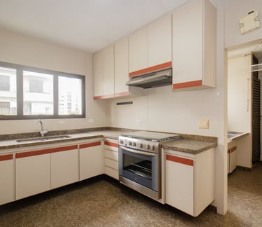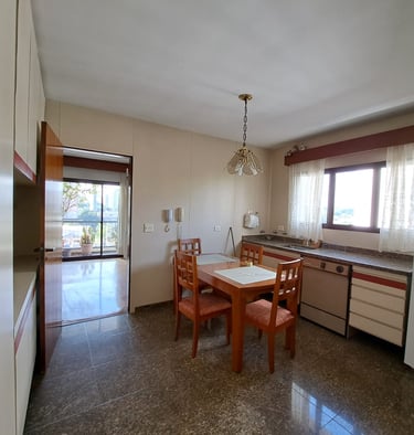 A cozinha é generosa podendo facilmente ser dividida em área de copa confortável e ainda manter cozinha ampla e funcional, além de área de serviço grande e independente com banheiro de apoio e quarto de serviço versátil, assegurando praticidade no cotidiano.